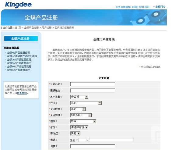 在金蝶KIS用户注册表中输入您的资料信息:单位名称、通讯地址、客户类型、行业、企业性质、企业规模、国家、省份、市/地区、电话、传真、电子邮件、企业网址、邮政编码、联系人、手机、经销商、购买时间。