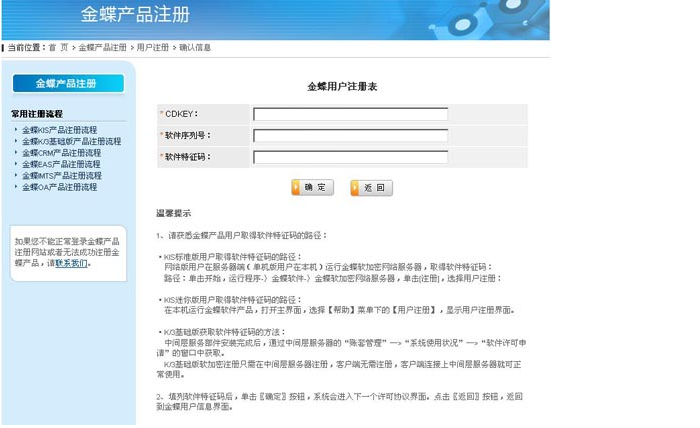 在 金蝶KIS软件安装完成后,您需要及时进行注册,请检查您的产品包装盒内的用户机密函件上是否存在注册需要用到软件序列号和CDKEY,如果不存在请立即联系金蝶公司经销商。详细的注册步骤如下: