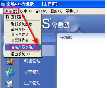 首先需要登录金蝶KIS专业版,然后通过菜单系统--》自定义报表维护,进入自定义报表维护功能操作界面: