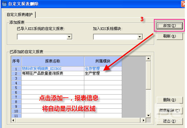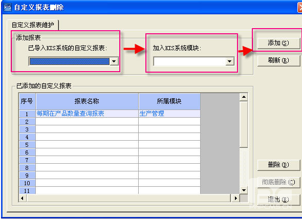 这时,我们只需要选择已经导入的报表,并确定需要将此报表发布到哪一个管理系统中,再点击添加即可完成。如我们选择将报表发布到仓库管理系统中: