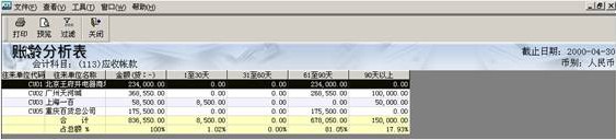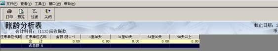 2、如果进行了往来核销,查询账龄分析表的结果如图(2),可以看出:关于这笔应收账款的数据不再显示在账龄分析表中。