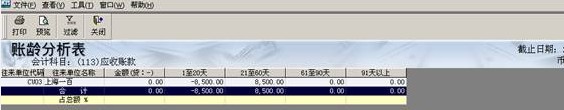 1、如果我们没有进行往来核销,查询账龄分析表的结果如图(1),可以看出:1-20天:-8500、21-60天:8500