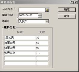会计科目:在此输入框中输入要进行账龄分析的会计科目代码。要注意,此处所选的科目代码必须是下设往来业务核算的科目。如果没有下设往来业务核算,则会输出一张空白账龄分析表。反之,则输出账龄分析表;截止日期:分析往来业务的账龄截止日期,即某项往来业务计算时间的截止日期,系统默认查询账龄分析表的当天日期。在这里您可以输入您需要的截止日期;币别:选择要查询账龄分析表货币币别;账龄分组:在此处可定义您的账龄分析表栏目结构,即您自己的账龄分组标准。系统预设了4种分组标准如图(4)所示,您可以根据需要自行修改。在修改账龄分组时,您只要直接修改天数即可,系统会自动更新。