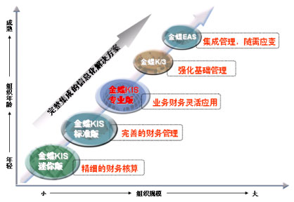 金蝶KIS专业版在企业信息化的过程中,提供阶段性的解决方案。而金蝶软件将提供的完整的产品支撑,从KIS到K/3再到EAS,在企业全生命周期中的不同阶段提供适用、可靠、先进的信息化解决方案。各产品间可以平滑升级,减少信息化建设的重复投资。