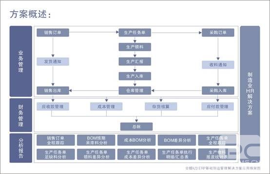 - 本方案的核心设计思想是:以销售业务为源头,通过业务订单这个“火车头”拉动整个企业的生产、采购、仓储一直到出运整个流程,实现销售、生产、采购三大业务以订单为核心的可视化全程跟踪;并辅以产品成本、订单成本等计算与分析工具,以科学规范的生产数据管理,帮助企业建立以销售订单驱动生产和采购业务的生产管理模式。