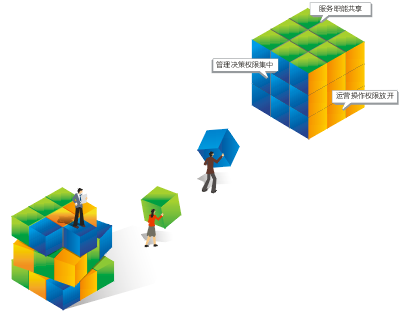 为避免集团企业管理中“一放就乱、一管就死”的现象发生,将重大决策权限集中到总部,由总部进行系统性的体系标准制定,以保障集团管控力;而同时在下属单位具体业务运营过程中,给予体系标准基础上适当的灵活性,提高运营效率;集团总部在与下属分子公司的业务关联上,要充分扮演好服务者的角色,成为政策、信息、资源、文化、品牌的服务中心。通过这一变革,将充分体现集团企业规模化管理的价值,促使集团综合实力最大化。