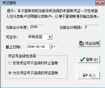 2、凭证编号连续与否对登账的取舍:在制作凭证时由于凭证的删除、手工编号等原因,可能凭证编号会出现断号的情形。因此在登账时,您需自行决定在凭证号出现不连续的情况下是否进行登账。如果选择“如果发现凭证号不连续时允许登账”,系统将忽视此种情形,进行登账。选择“发现凭证号不连续时终止登账”项,系统将对此进行检测,如果某类凭证其凭证编号不连续时,当前范围内所有属于此种凭证类型的凭证将不能登账,此时您可以手工调整凭证编号或使用本系统提供的凭证重排功能来使凭证编号呈连续状态。默认的方式是凭证号不连续时终止登账。