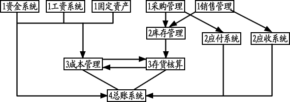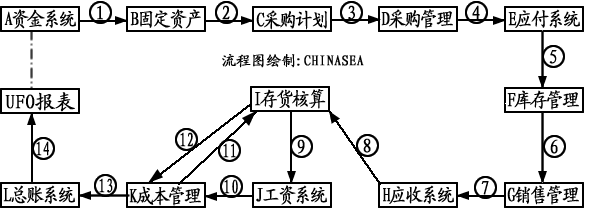 二、本套案列学习的顺序流程图如下(根据编号即可判断学习内容的先后顺序,此图只表示本案列 所设计的学习顺序示意图,但在各模块的启用顺序上请参照用友软件本身的详细说明去做):