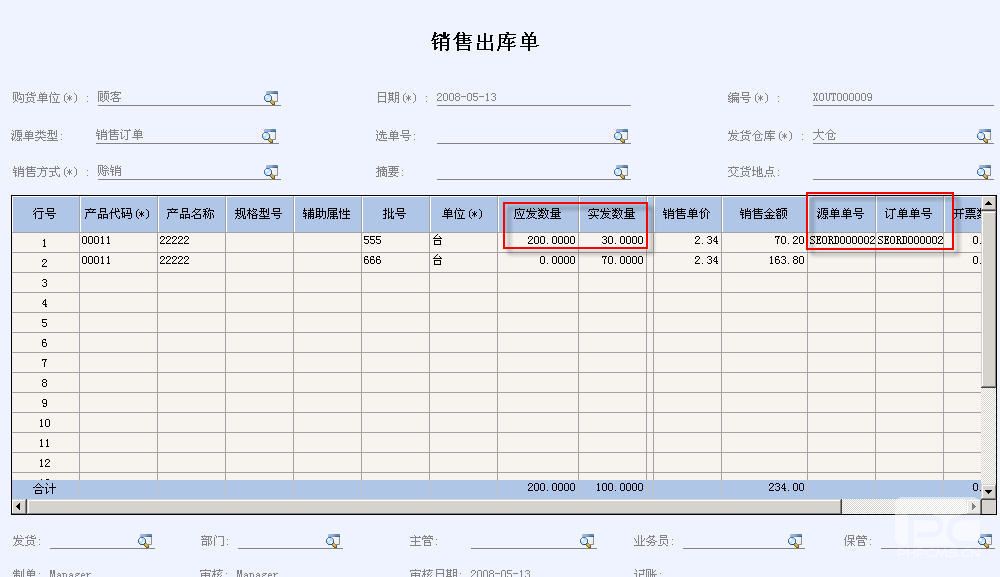 然后根据销售订单生成销售出库单。在销售出库单中输入批号,销售出库单时批号一为30个,批号二为70个。