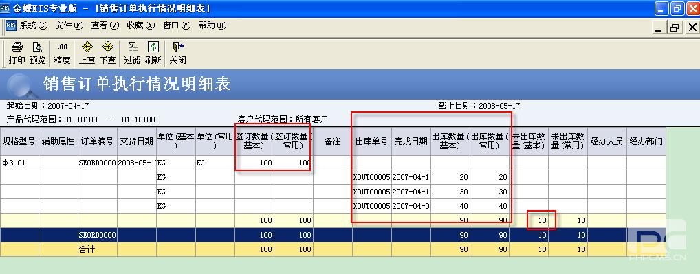 但是查询订单执行情况表中查询出结果为:订单200个,出库30个,没有包括上面出库单中的第2行的数据,